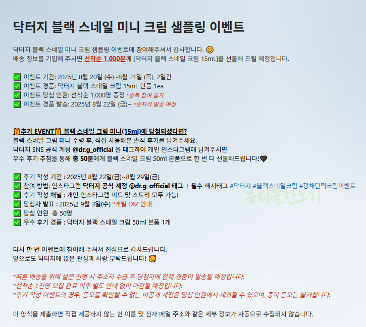 닥터지 블랙 스네일 미니 크림 샘플링 이벤트에 참여해주셔서 감사합니다. 😊 배송 정보를 기입해 주시면 선착순 1,000분께 [닥터지 블랙 스네일 크림 15mL]을 선물해 드릴 예정입니다. ✅ 이벤트