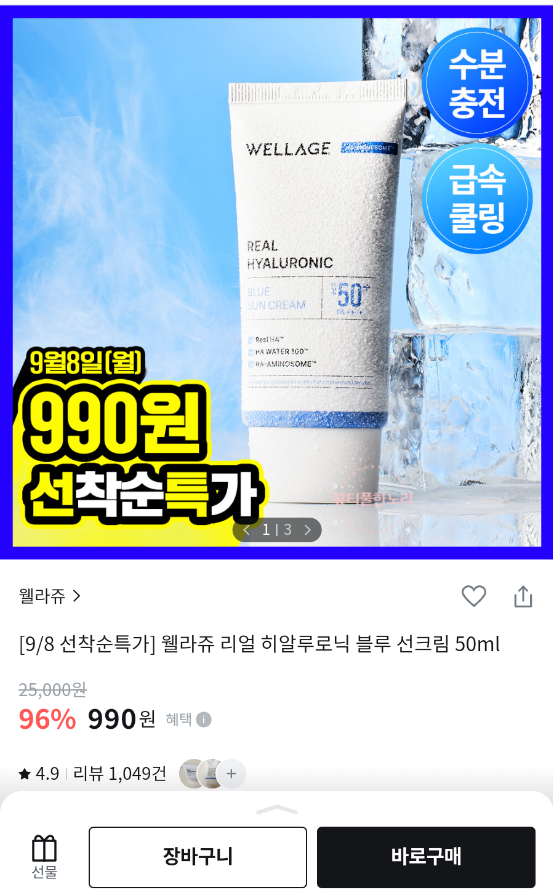 [Oliveyoung][9/8 선착순특가] 웰라쥬 리얼 히알루로닉 블루 선크림 50ml