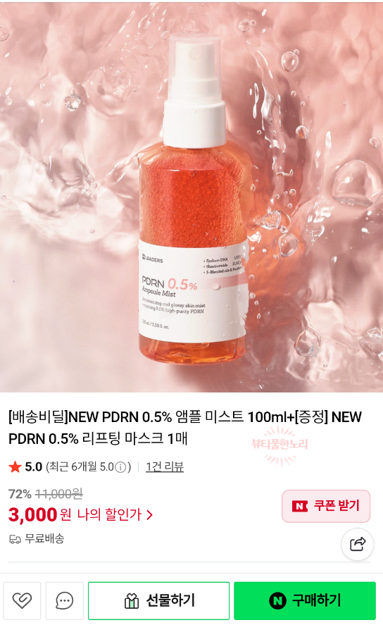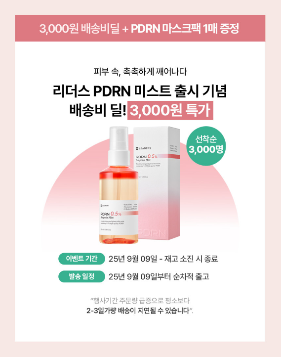 [배송비딜]NEW PDRN 0.5% 앰플 미스트 100ml+[증정] NEW PDRN 0.5% 리프팅 마스크 1매 : 리더스코스메틱