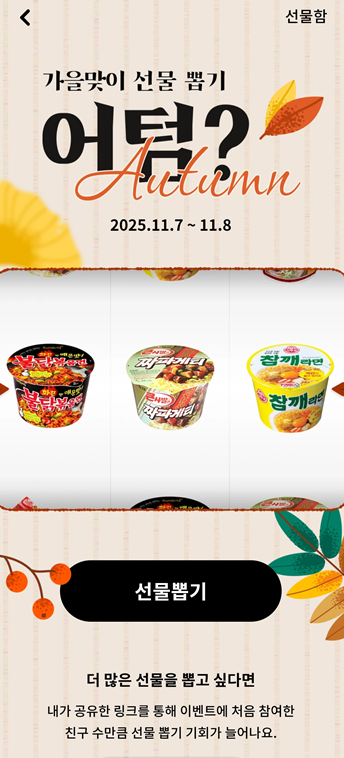 | [카드없어도됨❣️] 현대카드 즉당! 선물뽑기❣️ (라면/마이쮸등 즉당!!) ~10/31 (0) | 2025.10.30 |