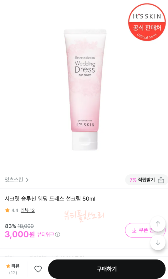 잇츠스킨 시크릿 솔루션 웨딩 드레스 선크림 50ml 3,000