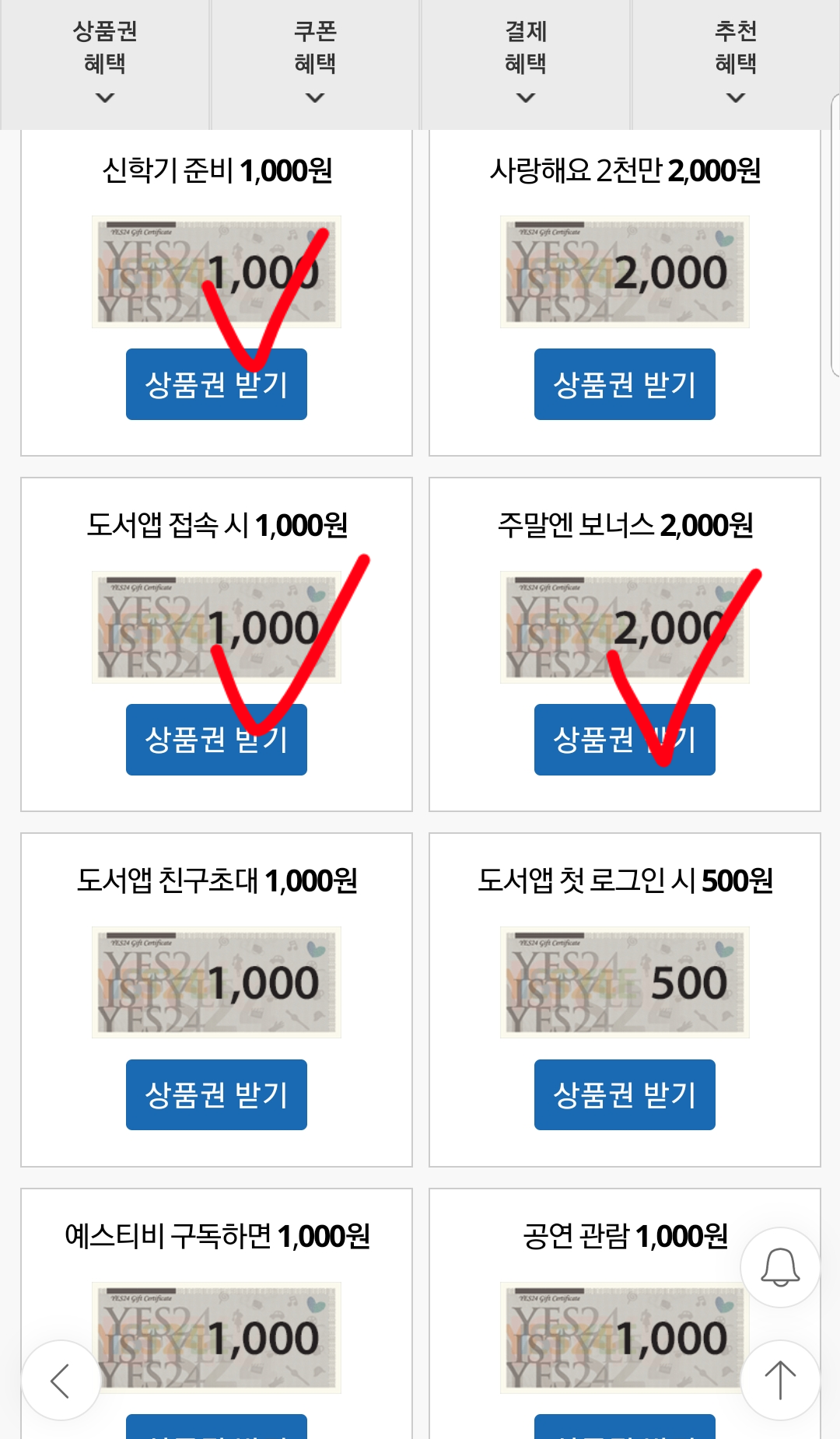 이번에는 예스24에서 도서지원금 상품권 5천원이나