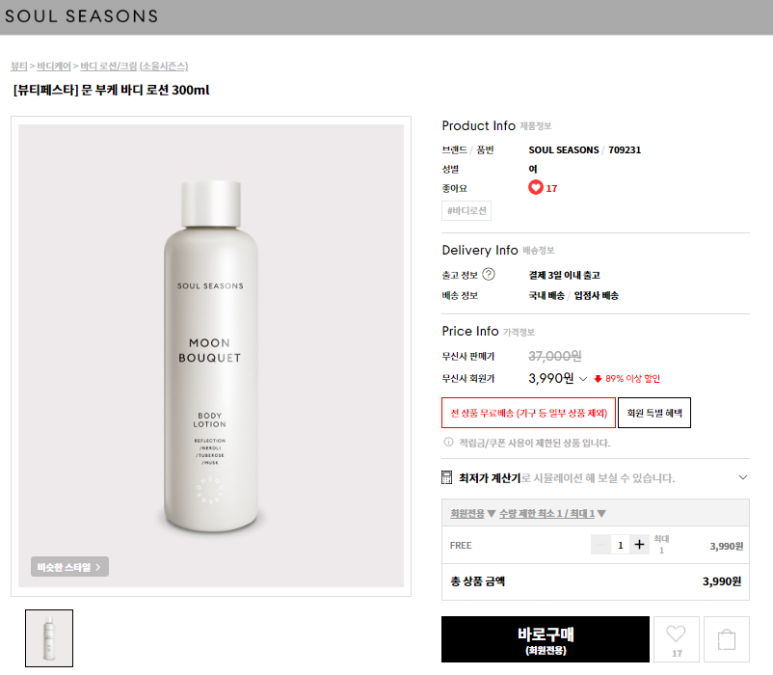 체험딜 제품이에요 소울시즌스 문부케 바디로션..